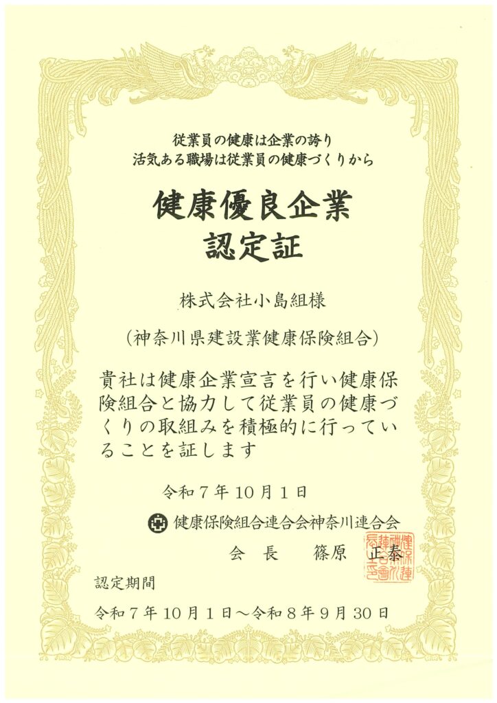 このたび、当社は健康保険組合連合会 神奈川連合会が行っている「かながわ健康企業宣言事業」に賛同し、「かながわ健康企業宣言」を行い、令和7年10月1日に健康優良企業として連続4回目の認定をいただきました!